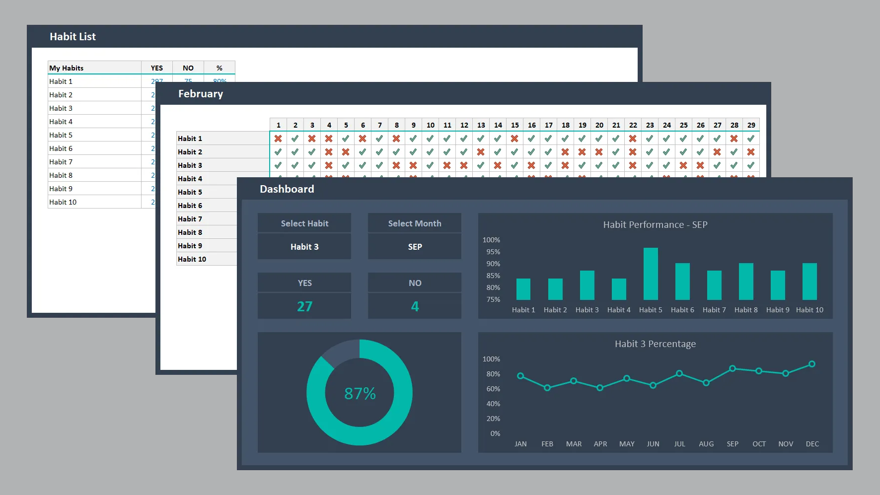 The Excel Habit Tracker allows you to track the performance of up to ten habits over the course of an entire year.