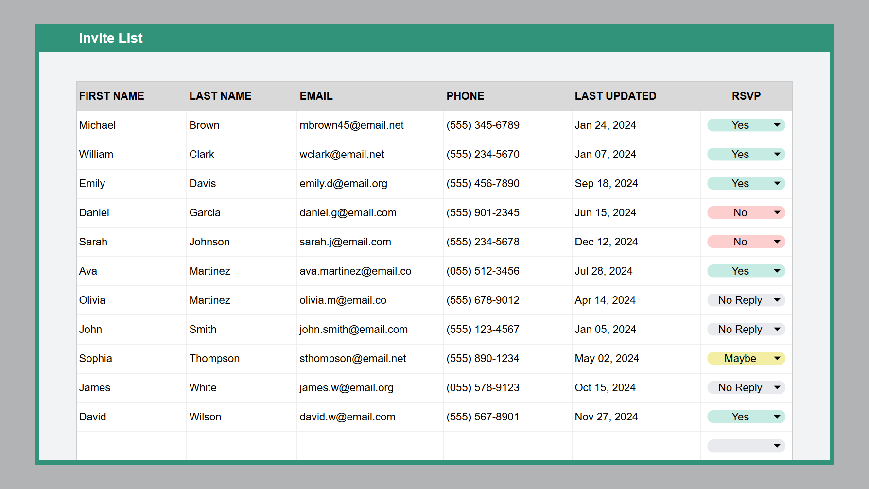 Store all guest details (like address, email, and phone number) and track their RSVP responses in one organized list.